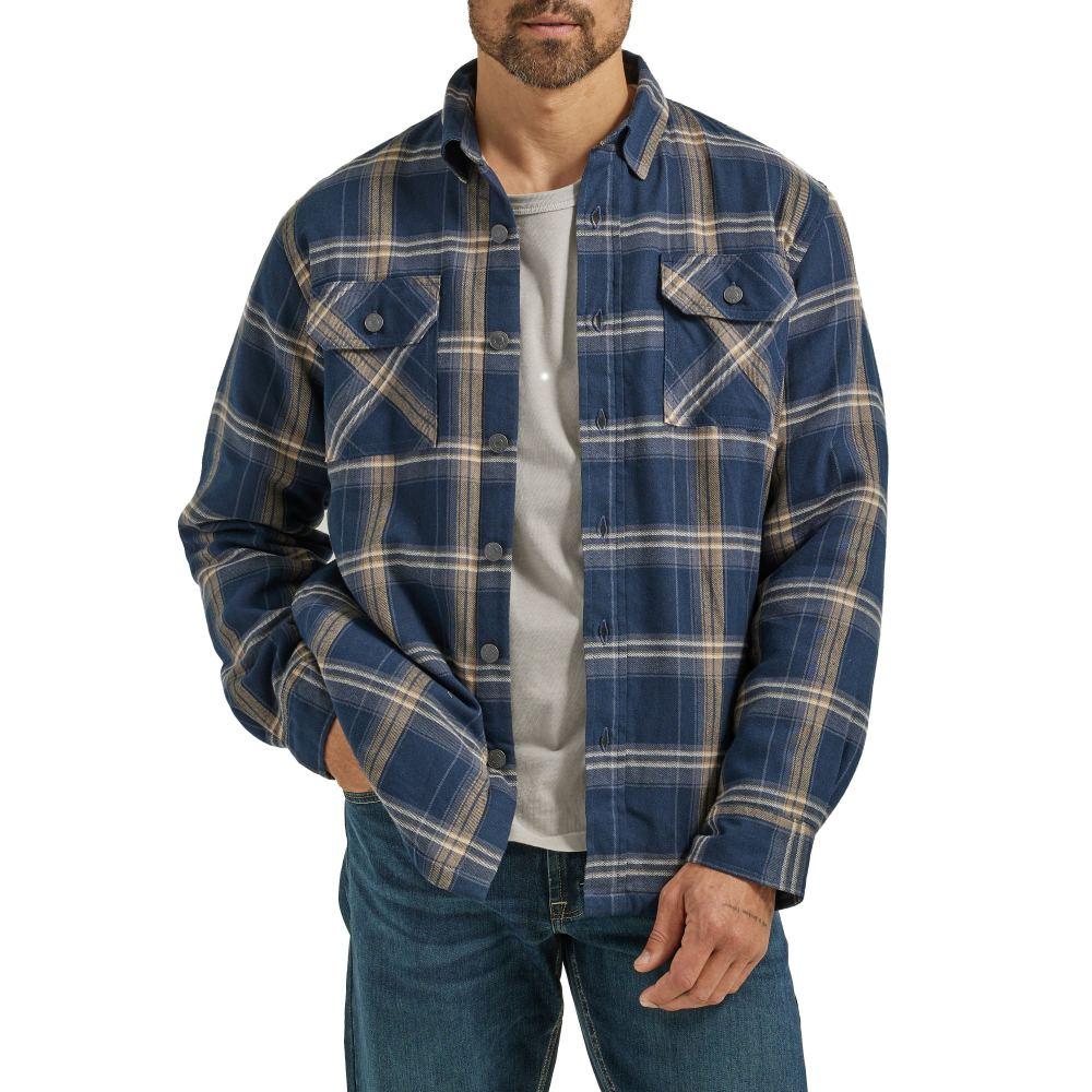 Куртка-сорочка темно-синього, майже чорного кольору на підкладці від легендарного бренда Wrangler. Фланелевий верх, підкладка з теплої якісної шерпи. Застібається на металеві ґудзики, як на джинсах. Дві бічні кишені на стегнах.